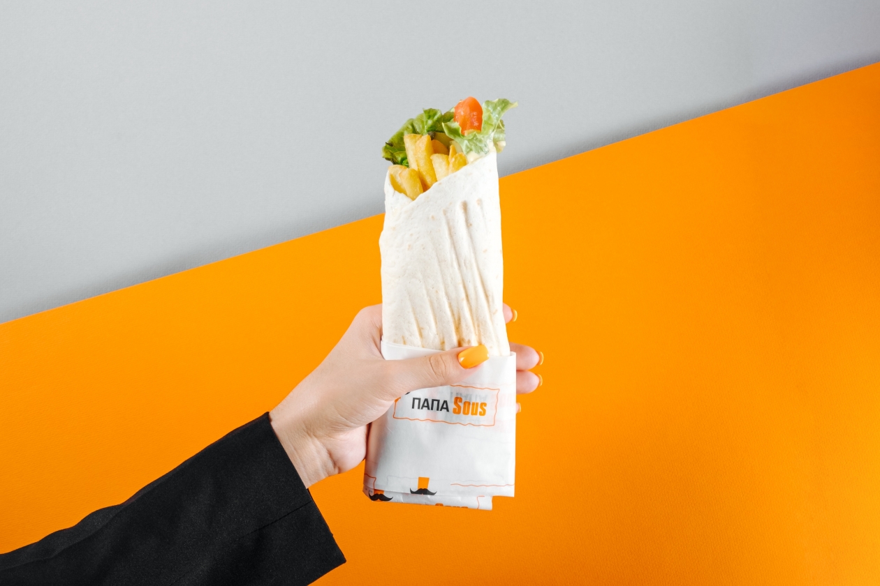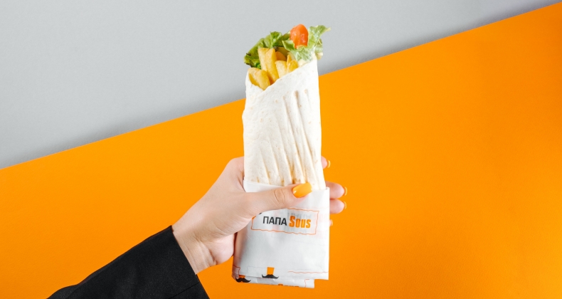 Состав: Пшеничная лепешка, салат, картофель фри, томат, маринованные огурчики, сырный соус.